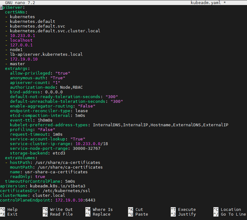 Это создает файл с именем kubeadm.yaml, содержимое которого может выглядеть примерно так (файл из вашего кластера может иметь другие значения):