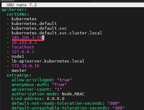 В этом конкретном примере дополнительные SAN не указаны. Чтобы добавить хотя бы один SAN, добавьте их в certSANs в разделе apiServer: